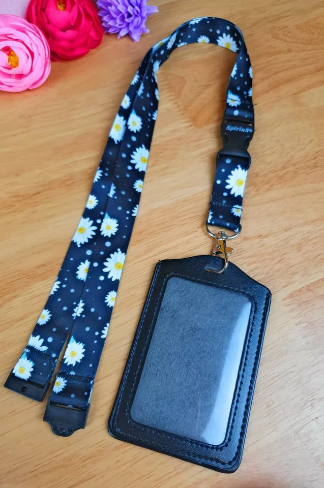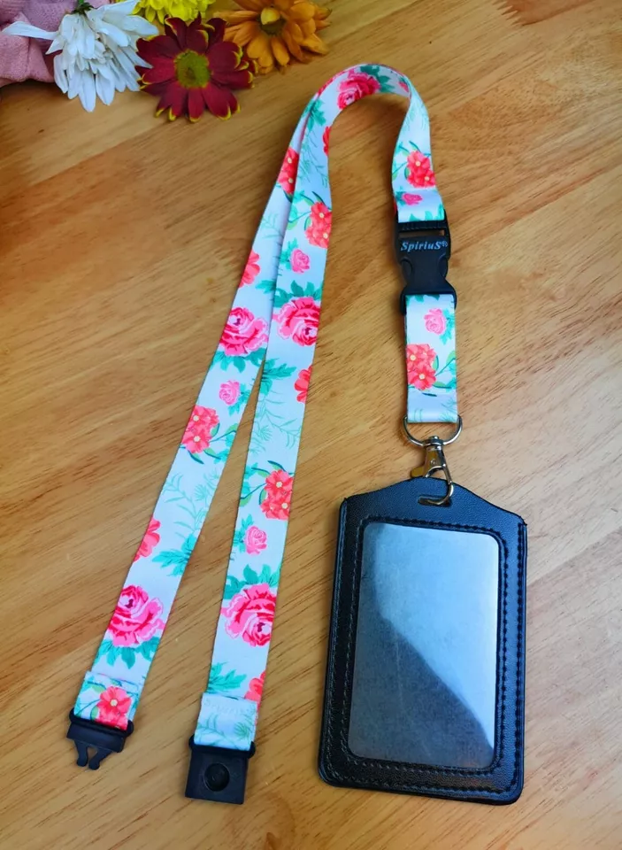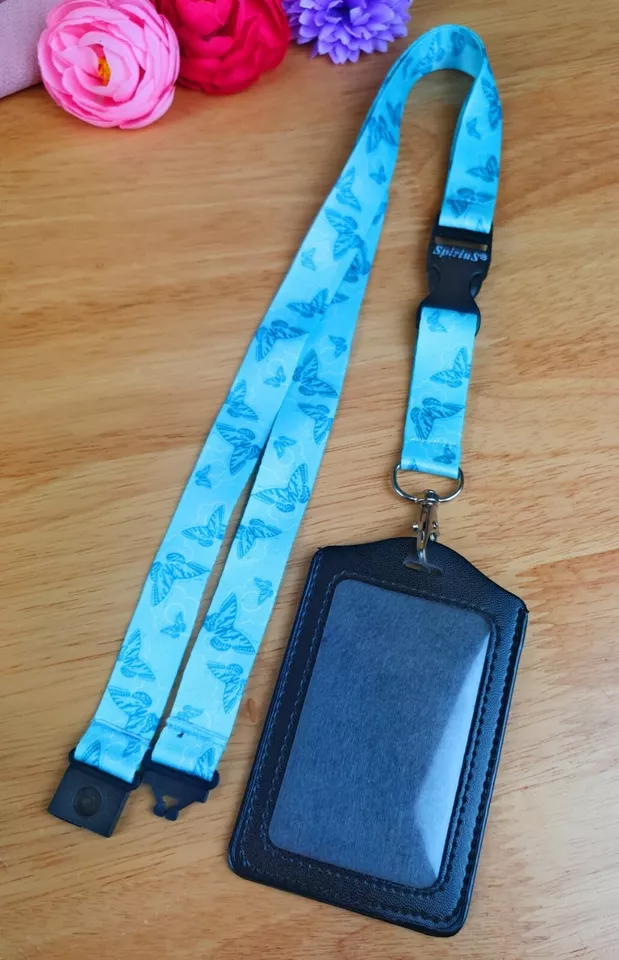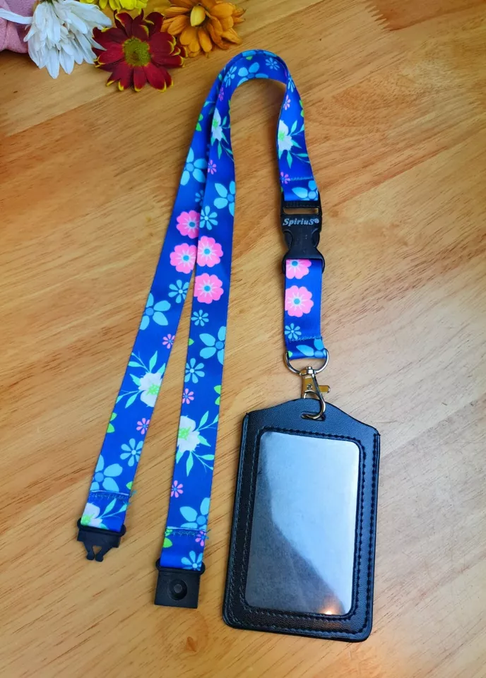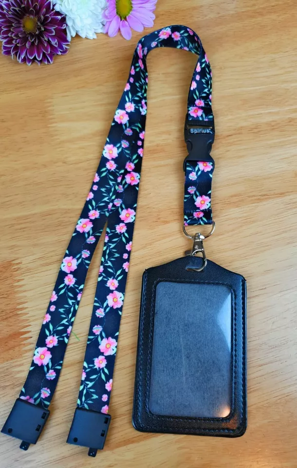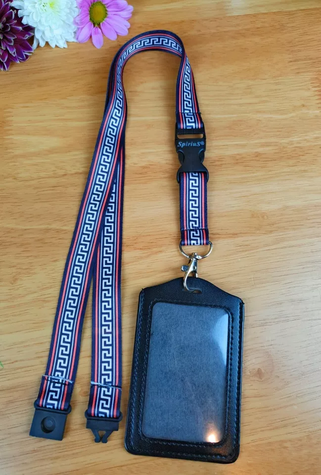 Black Leather ID Card Badge Holder with Spirius Original Lanyard Neck Strap