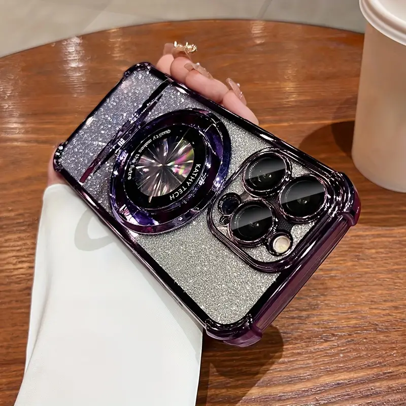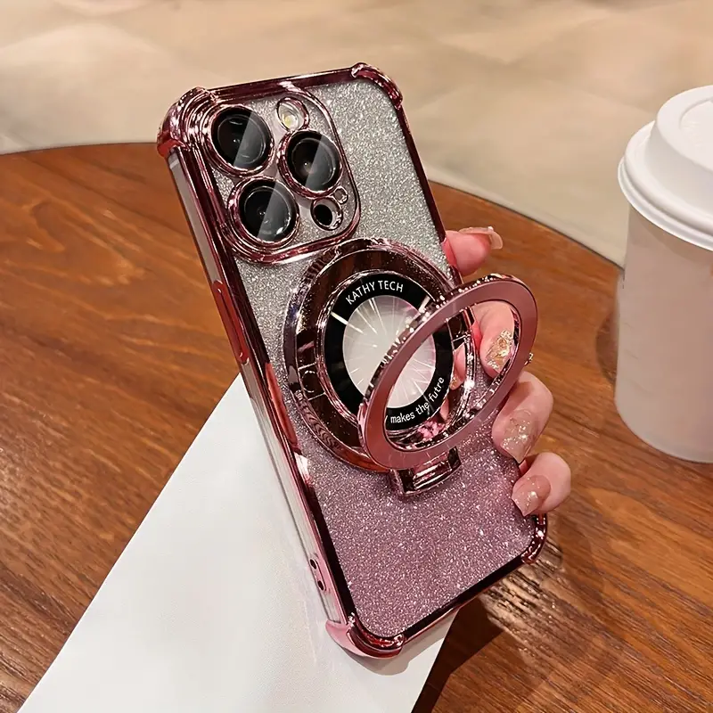 Luxury Glitter Transparent Case with Ring Bracket – MagSafe Wireless Charging & Camera Protection for iPhone 15/14/13/12 Pro Max, Plus