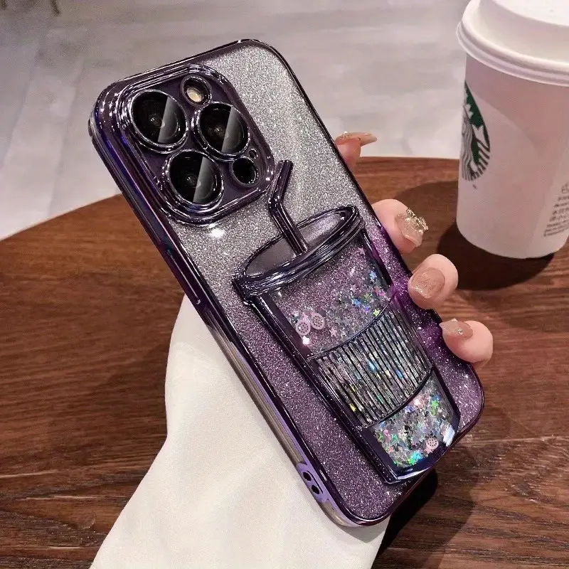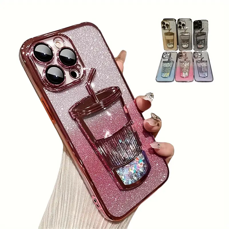 Summer Style Glitter Quicksand Phone Case – Gradual Milk Tea Cup Design for iPhone 15 Pro Max/14/13/12 Pro, Soft Transparent Protection
