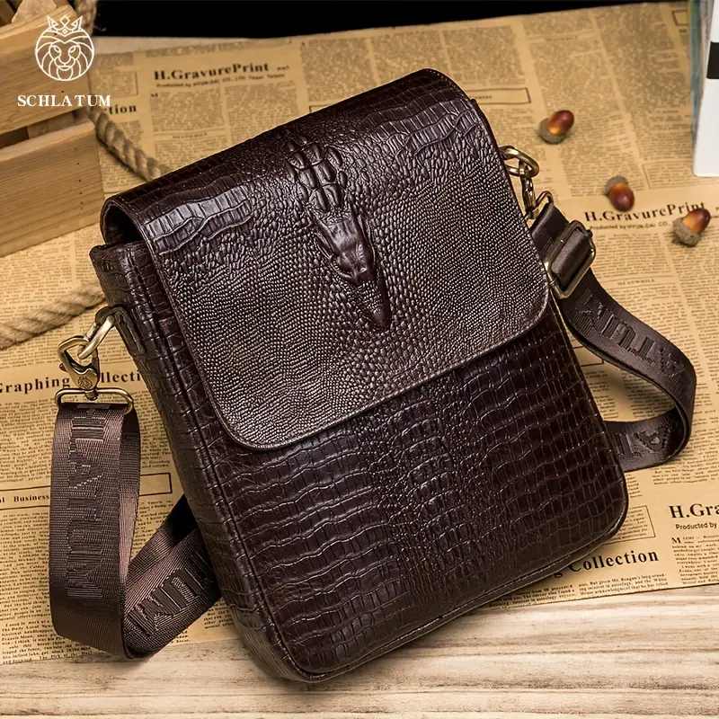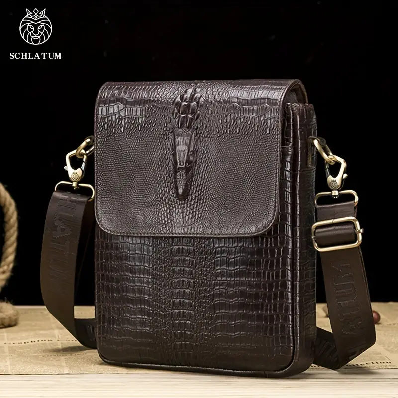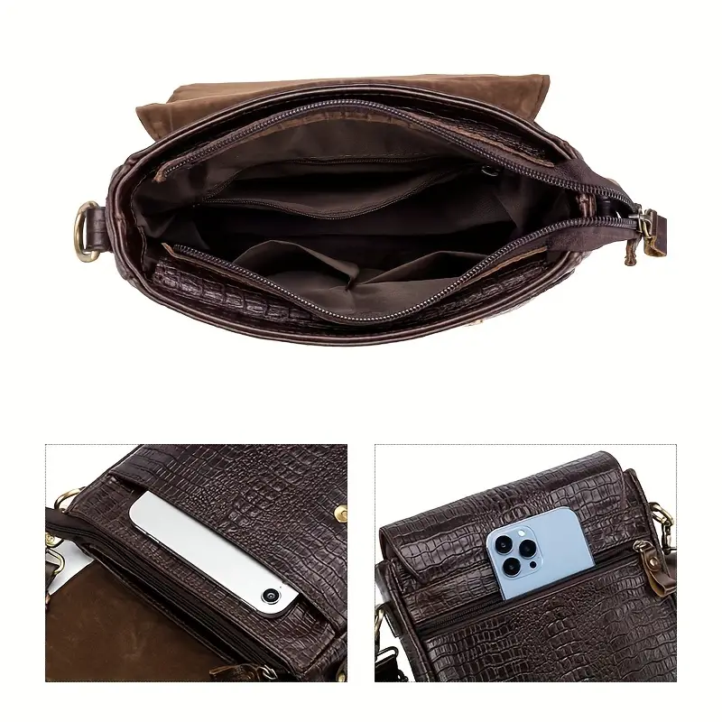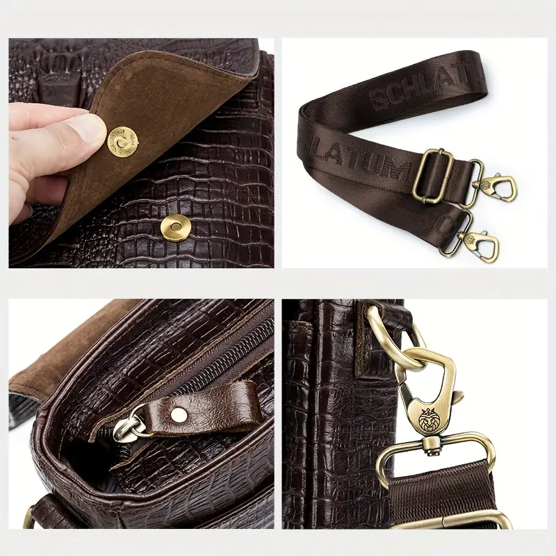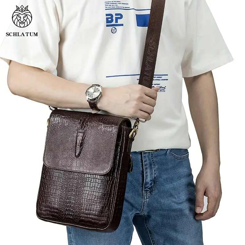 Men’s Genuine Cowhide Shoulder Bag – Vintage Crocodile Grain, Water-Resistant Crossbody for Stylish Daily Use