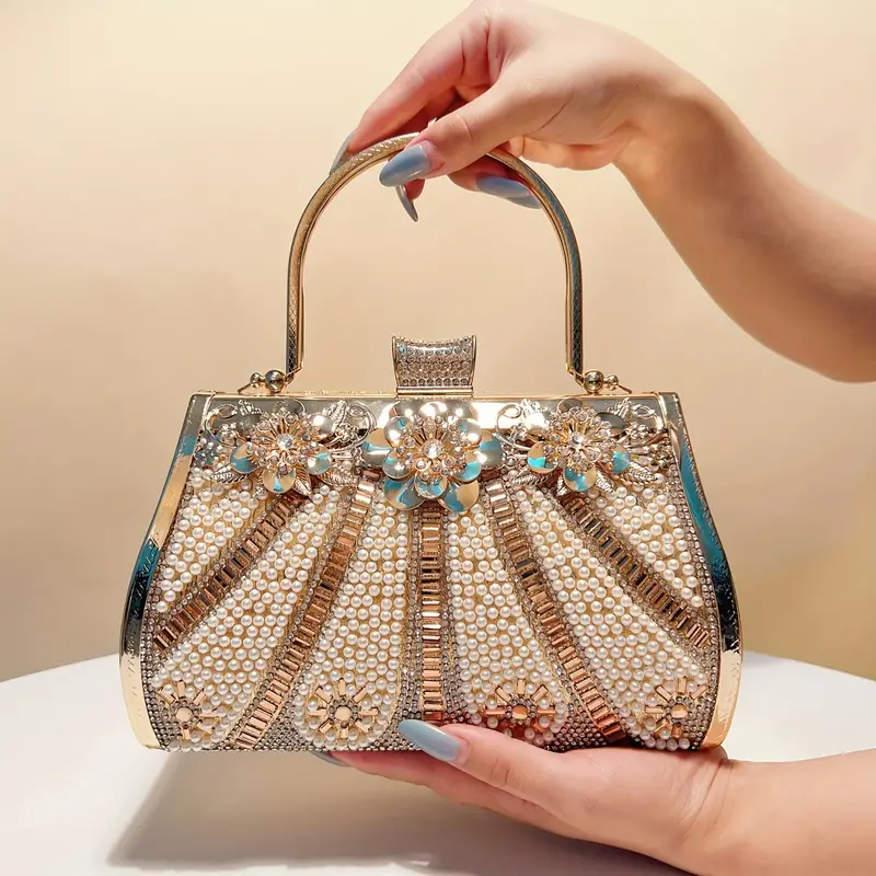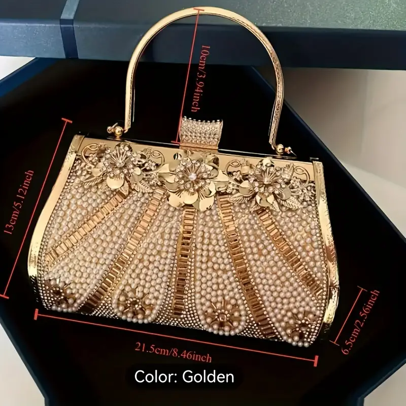 Opulent Golden Box Clutch – Vintage-Inspired Design with Pearls, Rhinestones & Satin Finish |