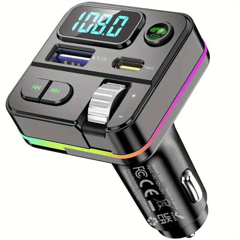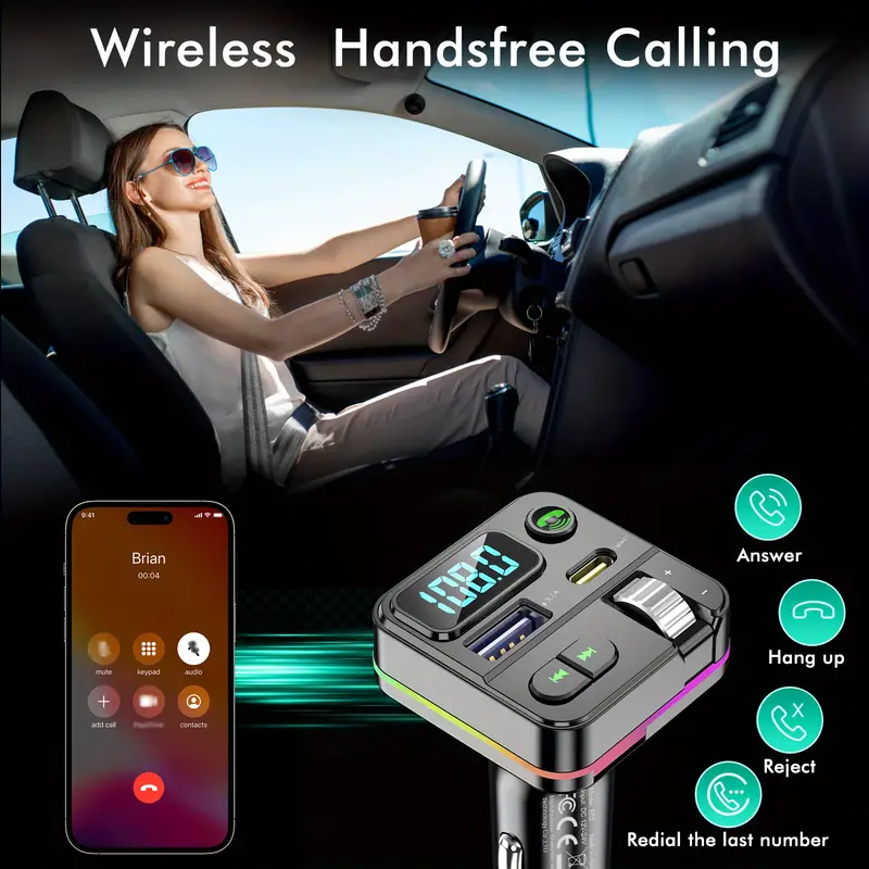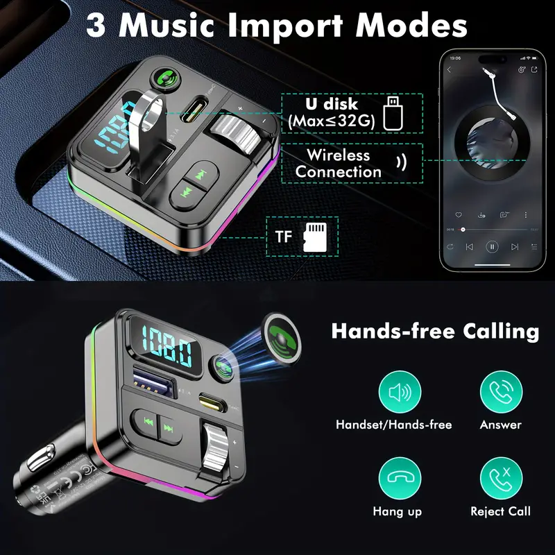 Rotatable FM Transmitter Car Kit – Wireless Handsfree Calling, Type-C Fast Charging, MP3 Player, and USB Charger