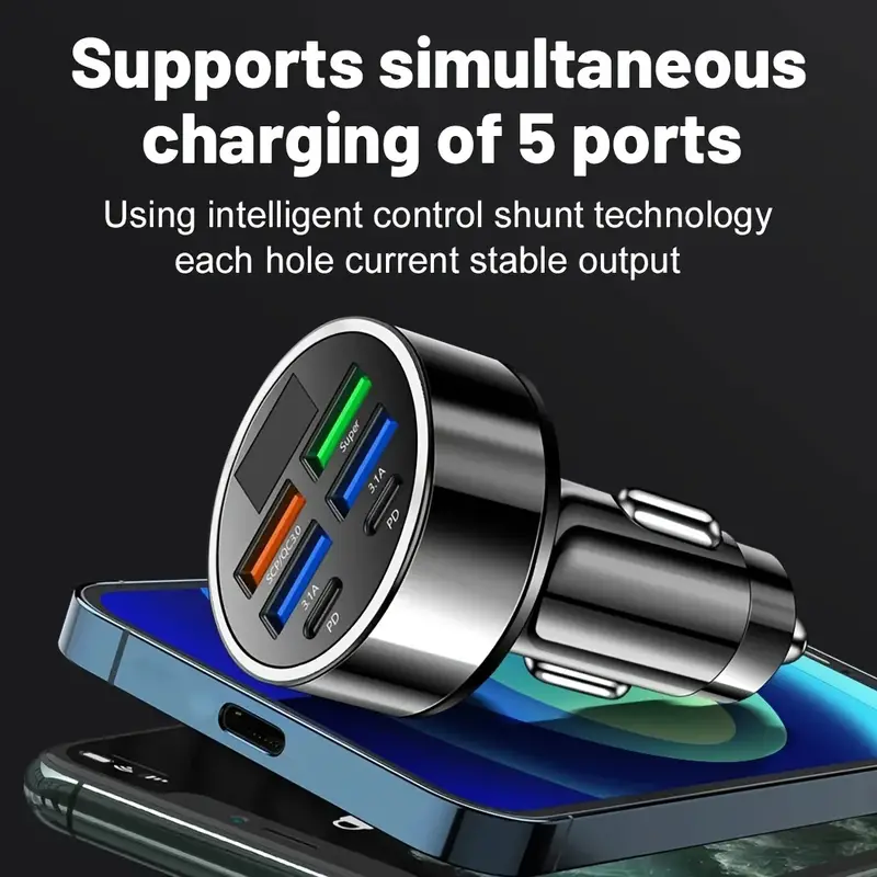 Digital Display FM Transmitter with Integrated Phone Charging – Vehicle Plug-In, 3.1A Quick Charge, Multi-Port (1-to-6) Charger