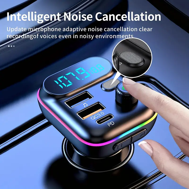 All-in-One Wireless Car Adapter – FM Radio Transmitter, MP3 Player, Dual Fast Charging, and 7-Color LED Display