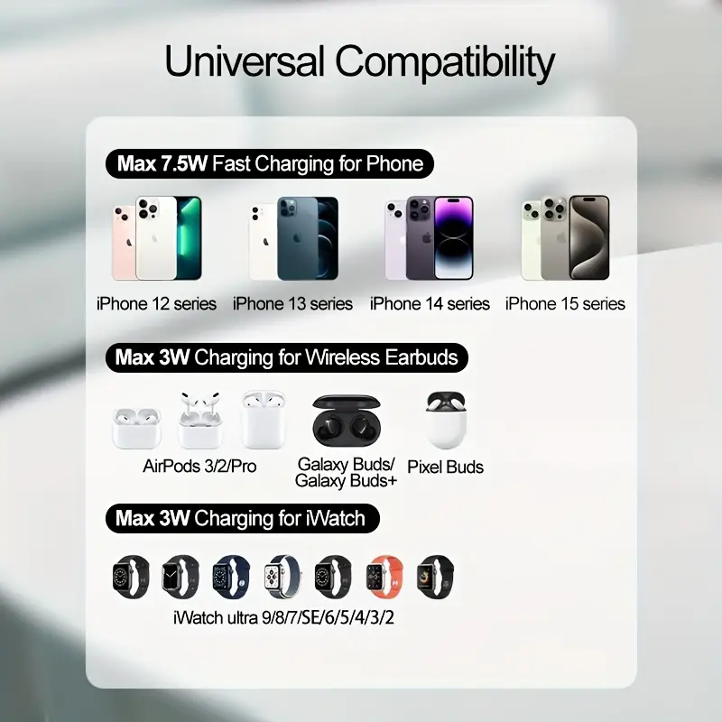 3-in-1 Wireless Charging Station – Fast Charger for iPhone 15/14/13/12 Series, iWatch Ultra/9/8/7 & AirPods Pro with Portable Design |