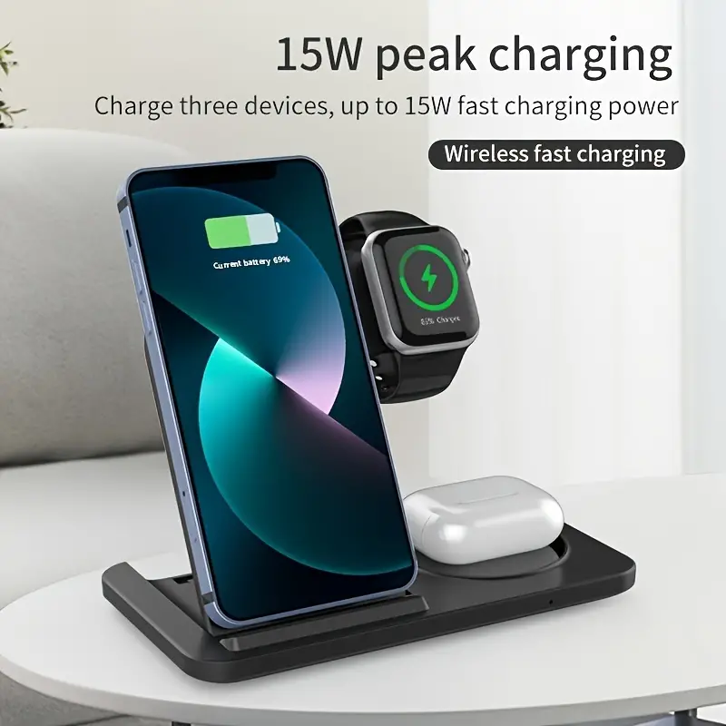Compact 3-in-1 Foldable Wireless Charger – USB-Powered Dock for iPhone, iWatch, and AirPods Pro